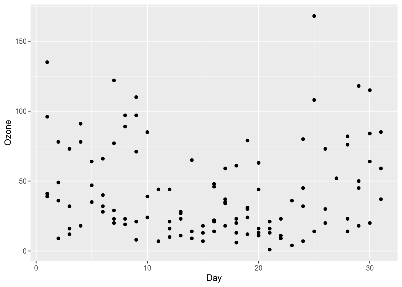 ggplot(airquality, aes(x = Day, y = Ozone)) +