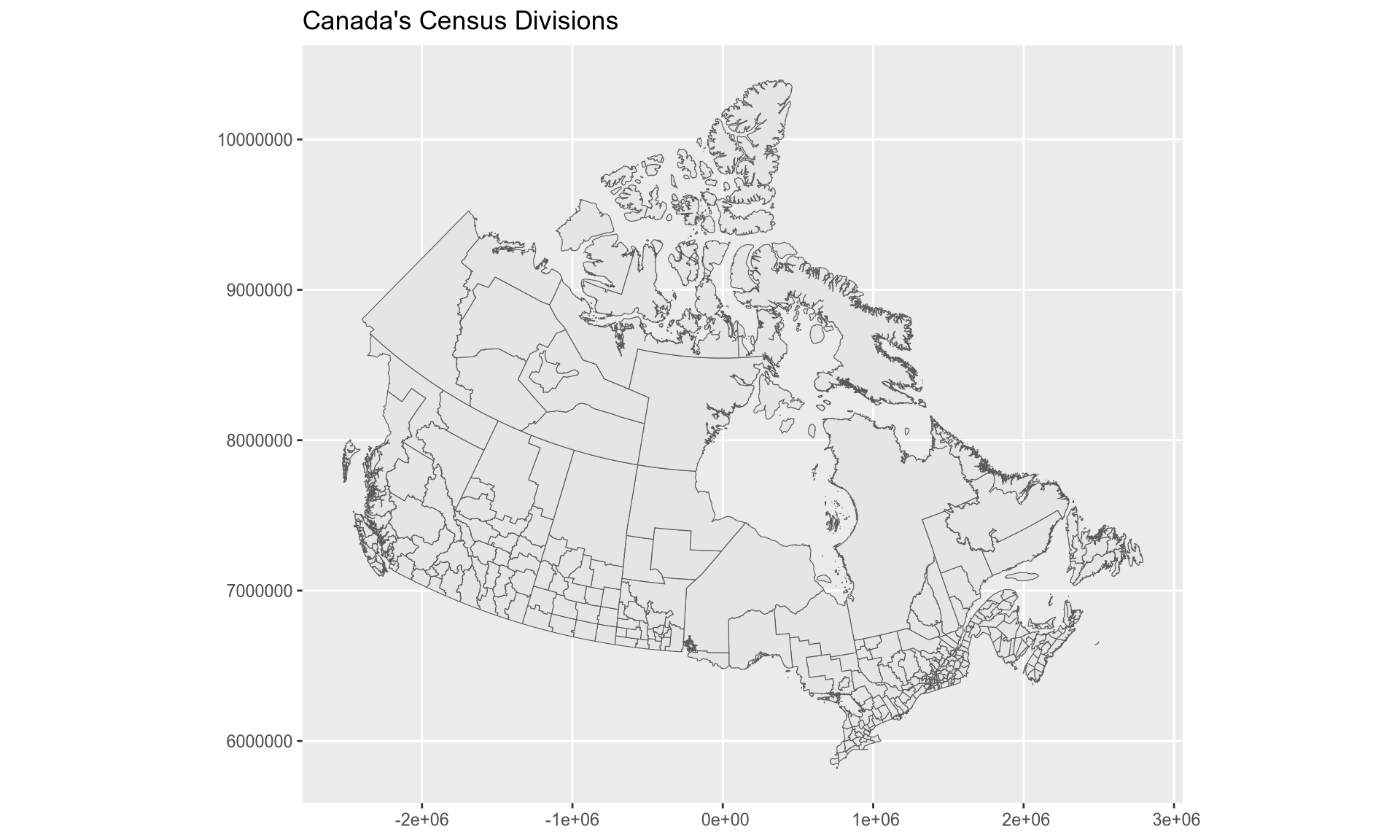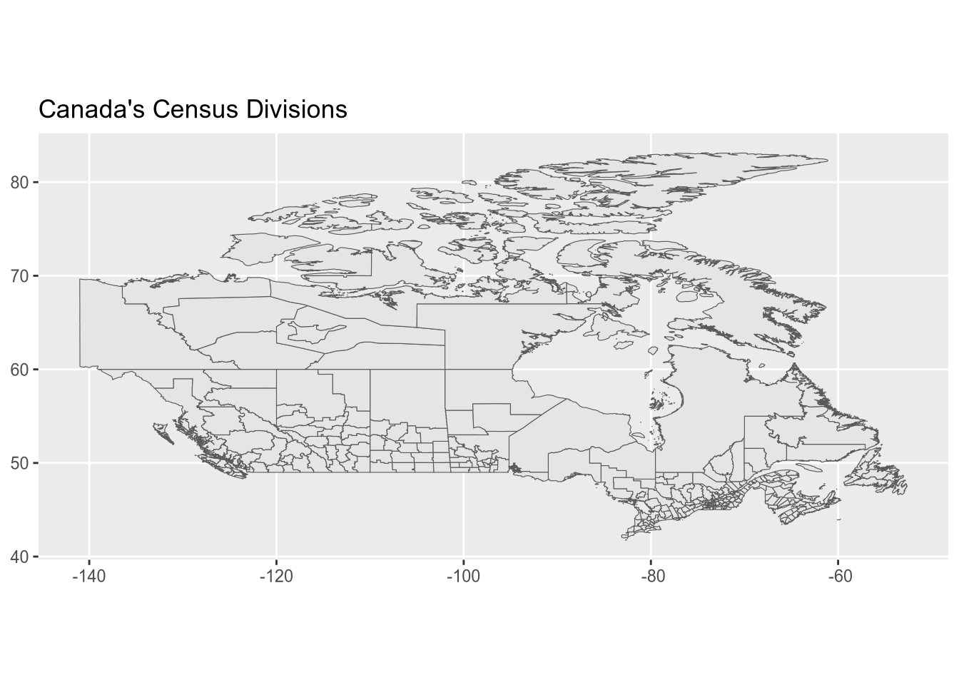 Plot maps of Canada with ggplot2 at different levels of aggregation.