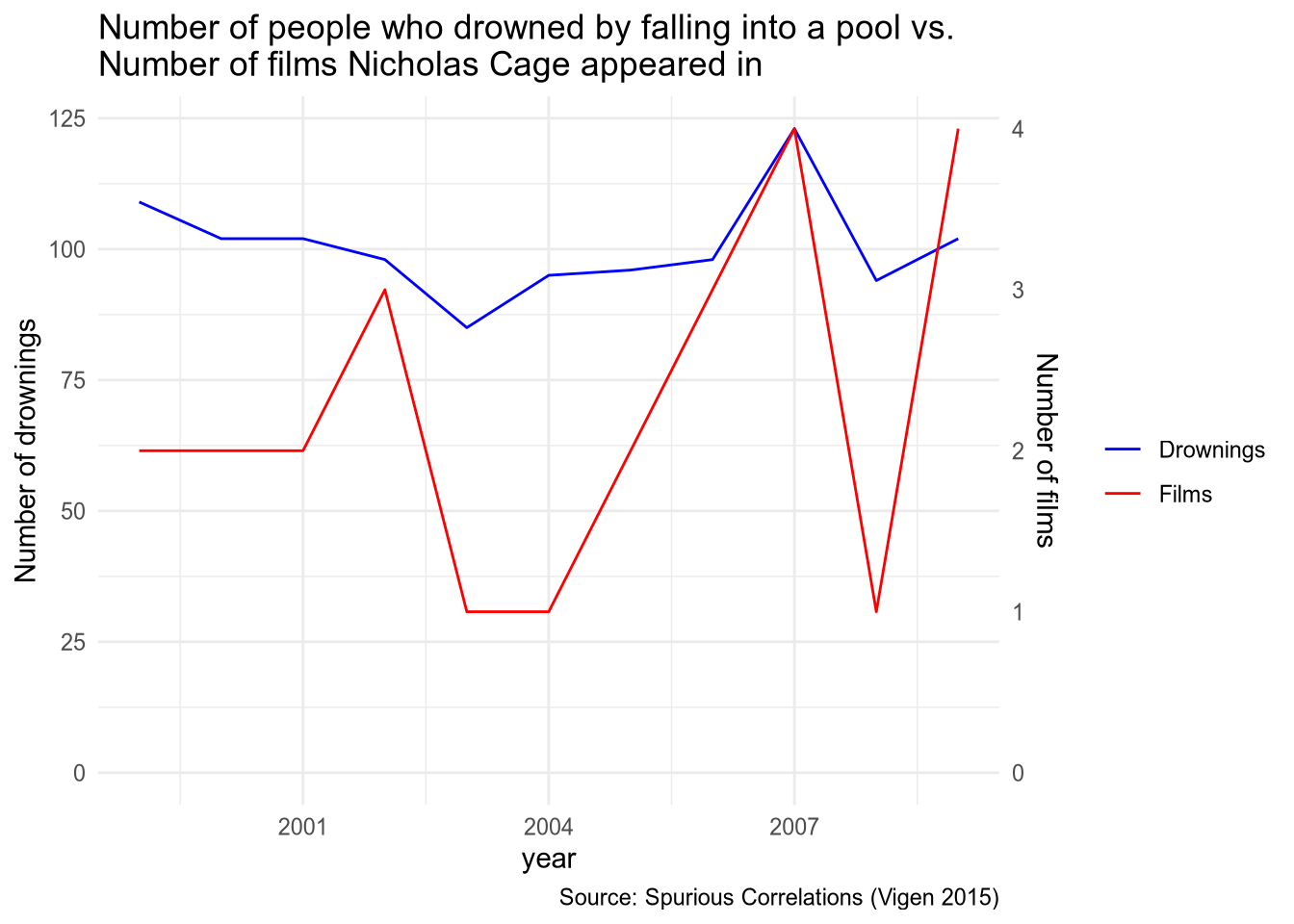 # compute a scale factor so that max(var2_value * factor) ≈ max(var1_value)max1 <-max(drownings$var1_value)max2 <-max(drownings$var2_value)ratio <- max1 / max2ggplot(drownings, aes(x = year)) +geom_line(aes(y = var1_value, color ="Drownings")) +geom_line(aes(y = var2_value * ratio, color ="Films")) +scale_y_continuous(name ="Number of drownings",sec.axis =sec_axis(~ . / ratio,name ="Number of films" ),limits =c(0, NA) ) +scale_color_manual(name ="",values =c("Drownings"="blue","Films"="red" ) ) +theme_minimal() +labs(title ="Number of people who drowned by falling into a pool vs.\nNumber of films Nicholas Cage appeared in",caption ="Source: Spurious Correlations (Vigen 2015)" )