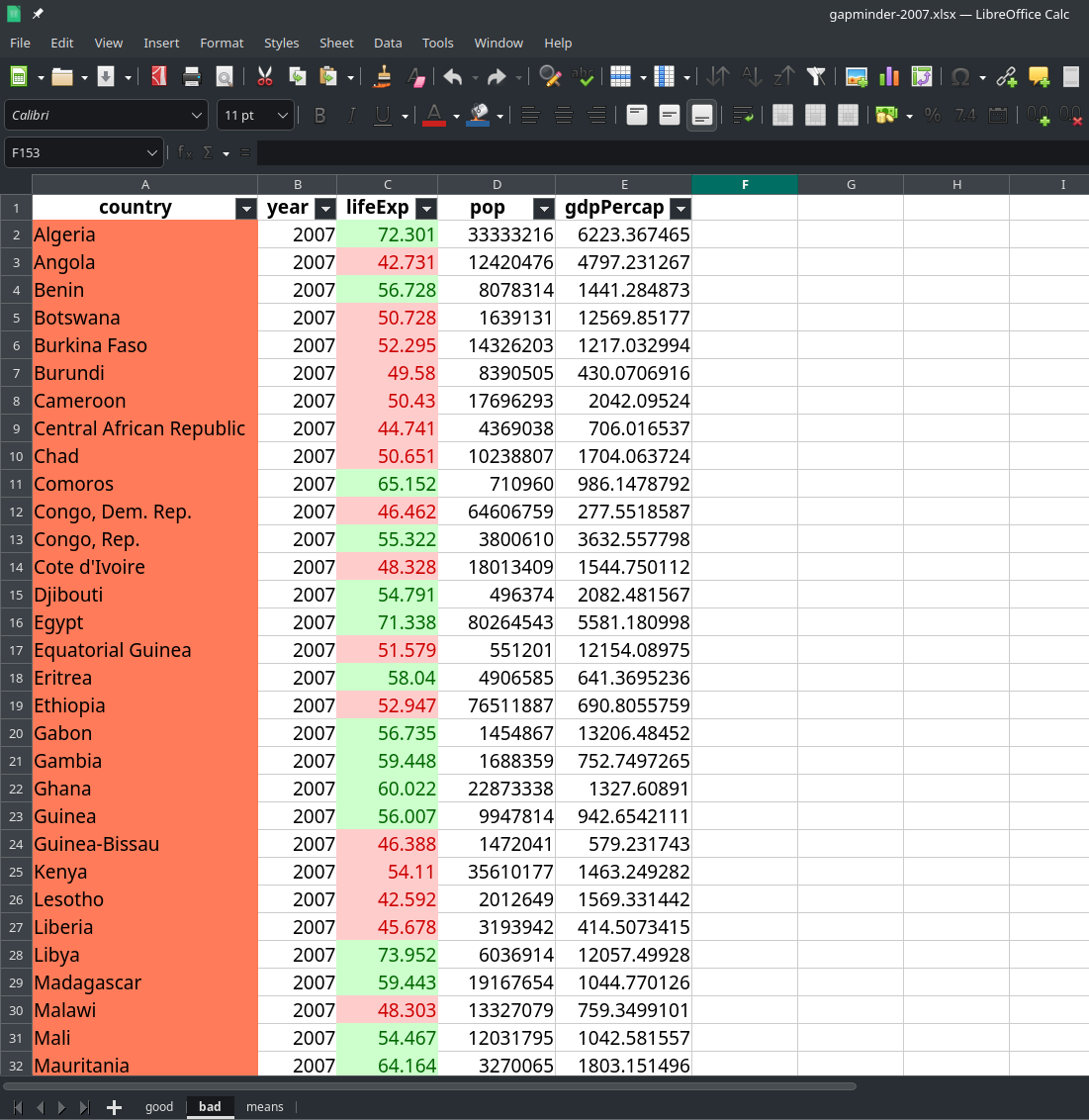 Then without the “good” sheet you need extra information not present in the file to know what the colours in “lifeExp” mean. In this case, the colour is used to express if the country in question has a life expectancy above or below the continent’s mean. This could be guessed dedicating time to explore the data, which can be time consuming and lead to wrong conclusions.
