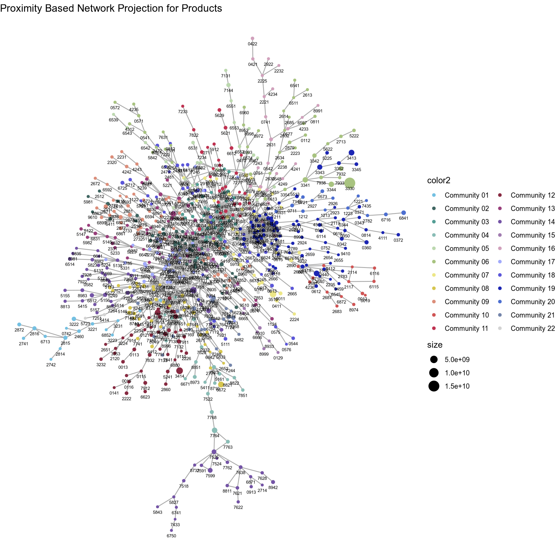 We can try to obtain clusters in a different way, by pre-specifying the number of communities. Because this has some arbitrary element, we can specify a number equal to the sections in the Harmonised System, which is 21 plus the unspecified products.