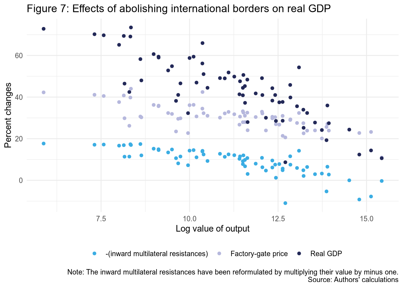 Box #2 from page 105 in Yotov et al. (2016) proposes two alternatives to define the counterfactual scenario of removing international borders. The first alternative is to eliminate the border variable and generate the logged trade costs used in the constraint.